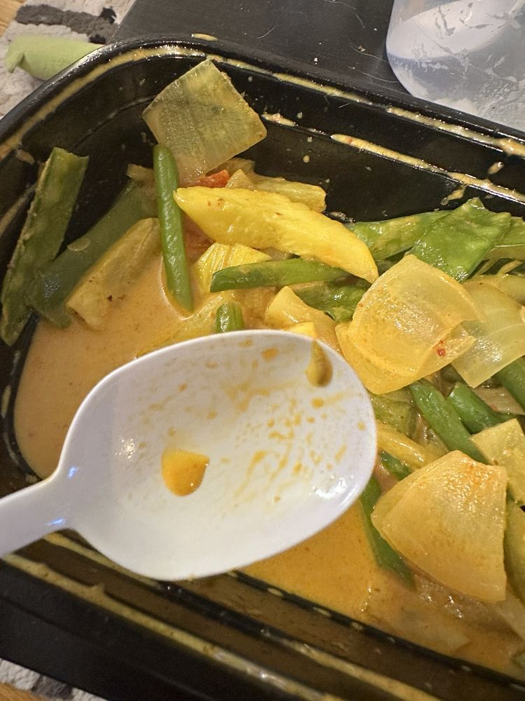 Coconut milk, bamboo, string beans, eggplant, green pepper and basil. Spicy